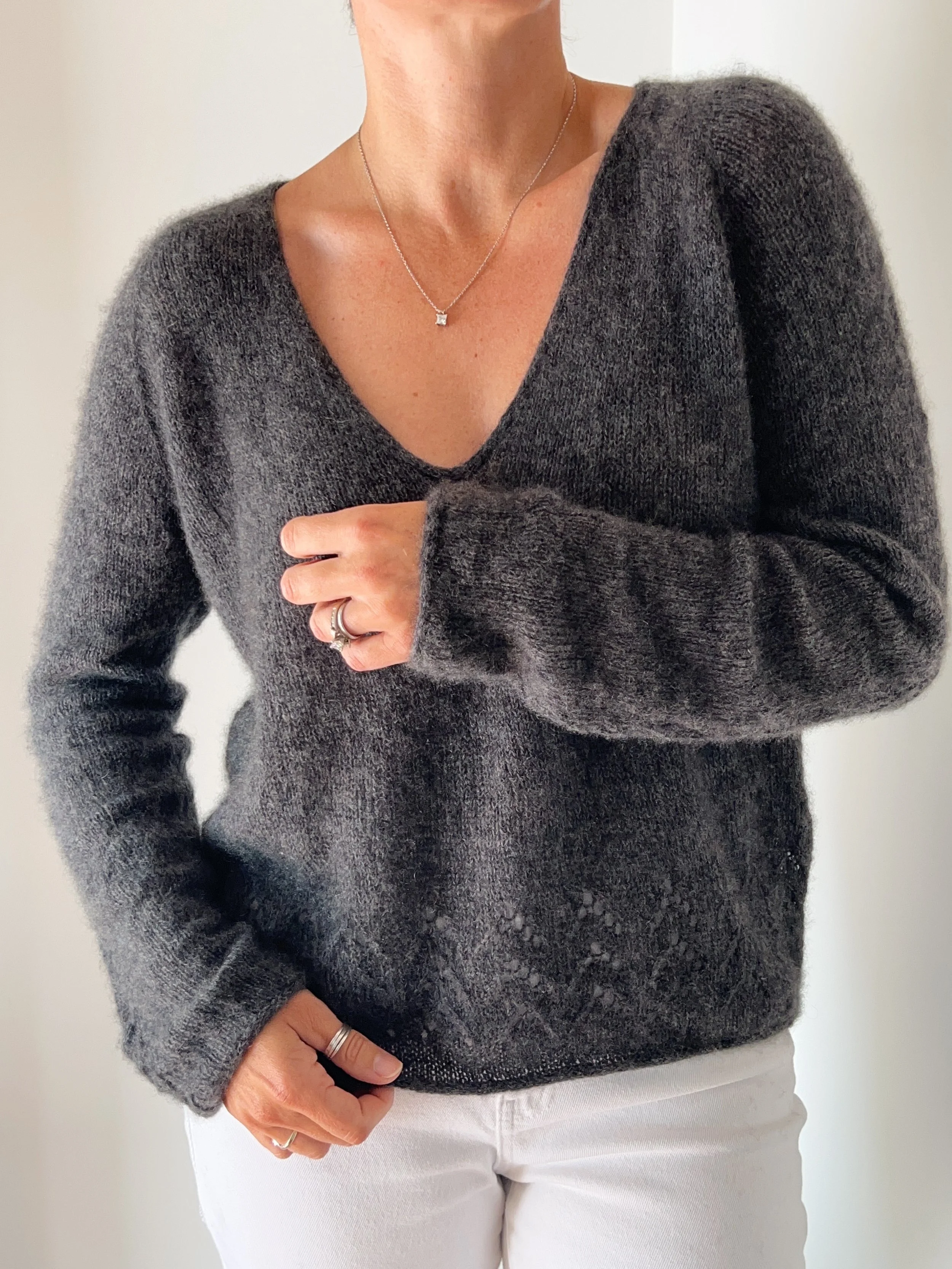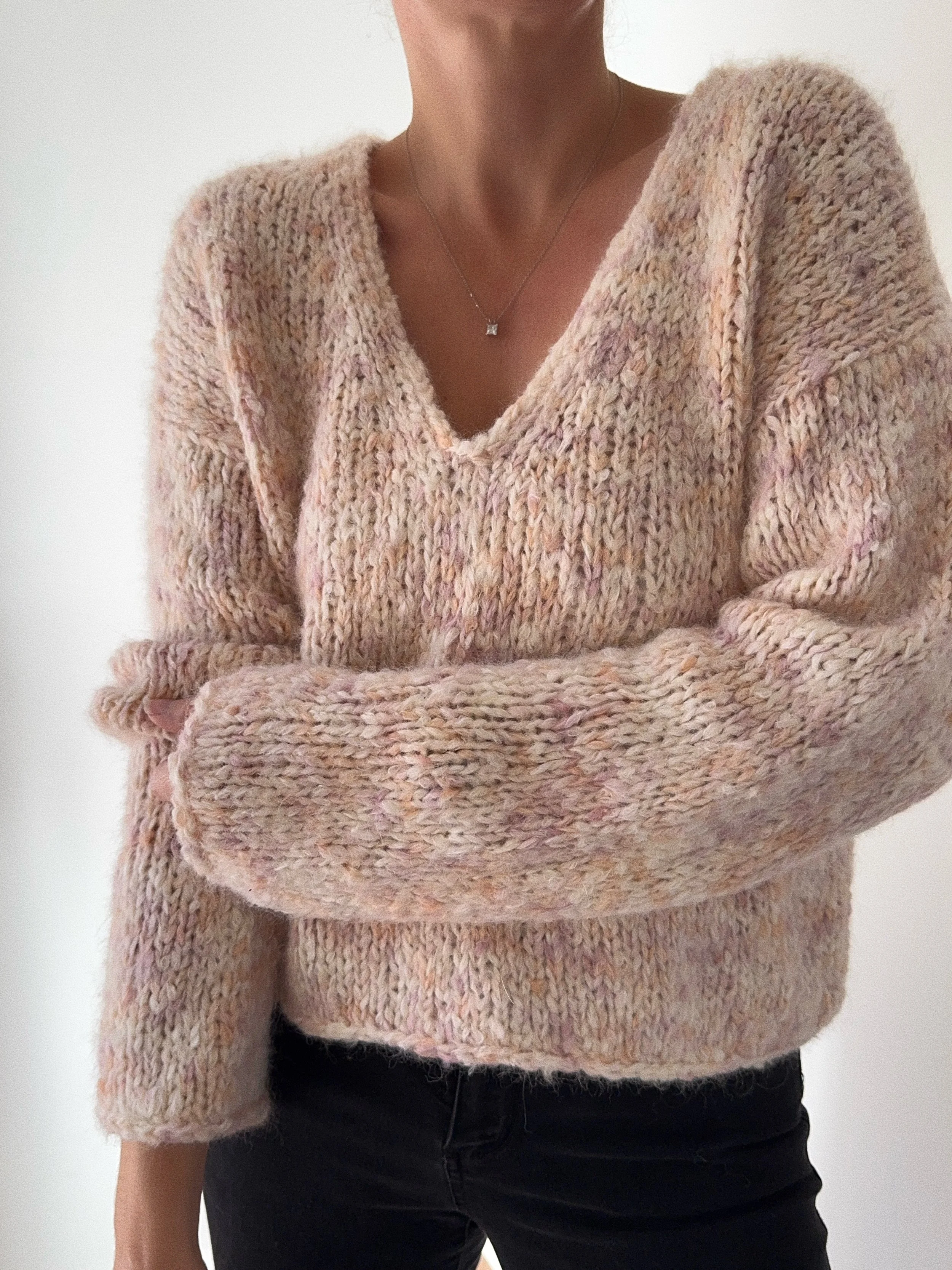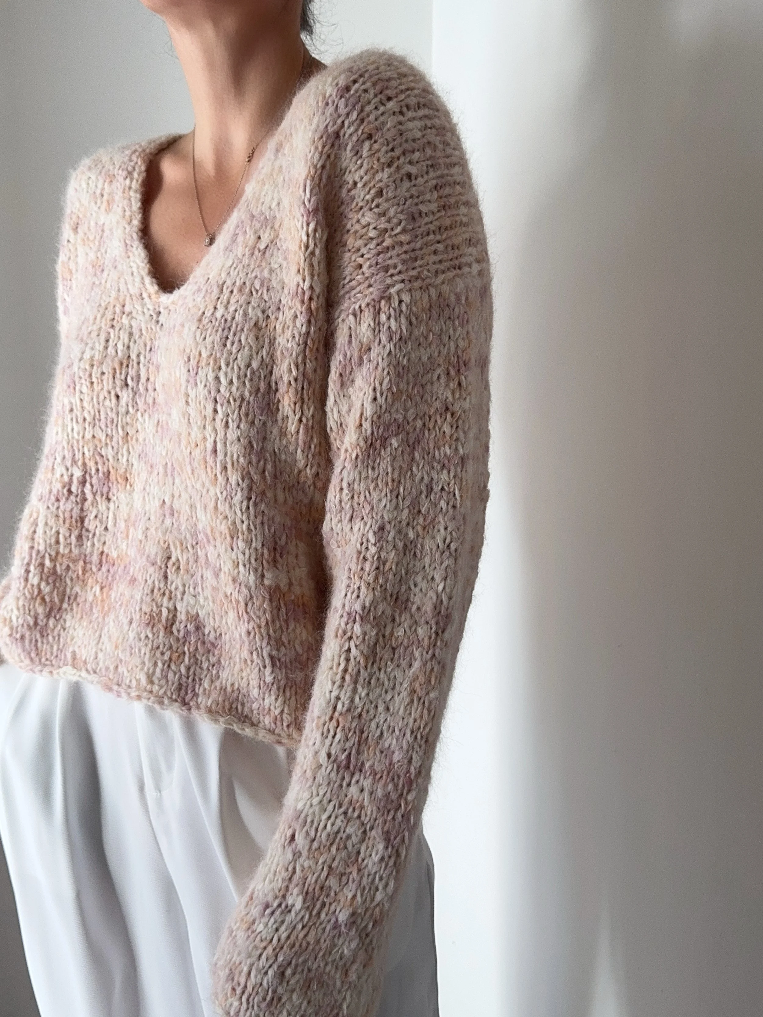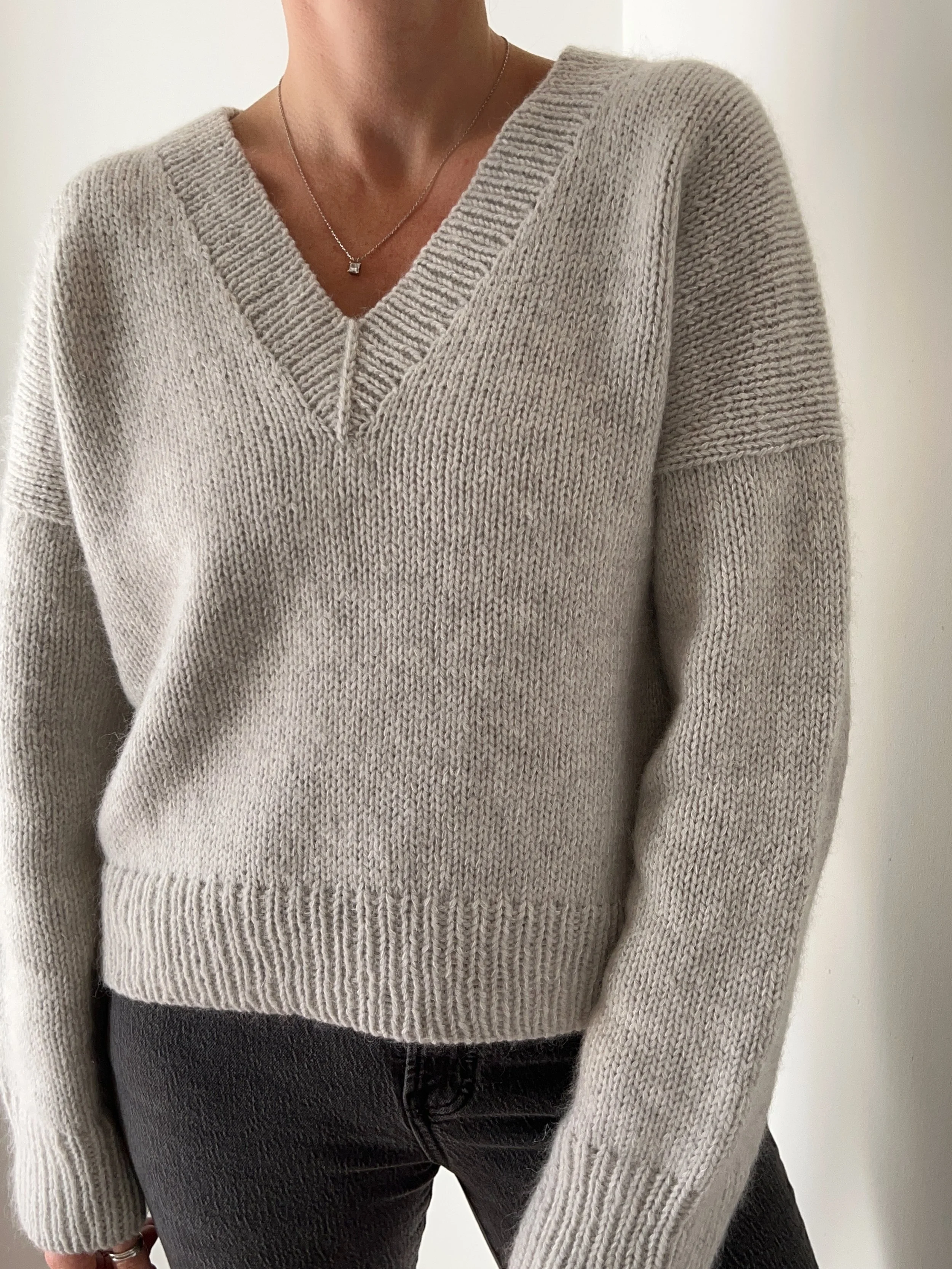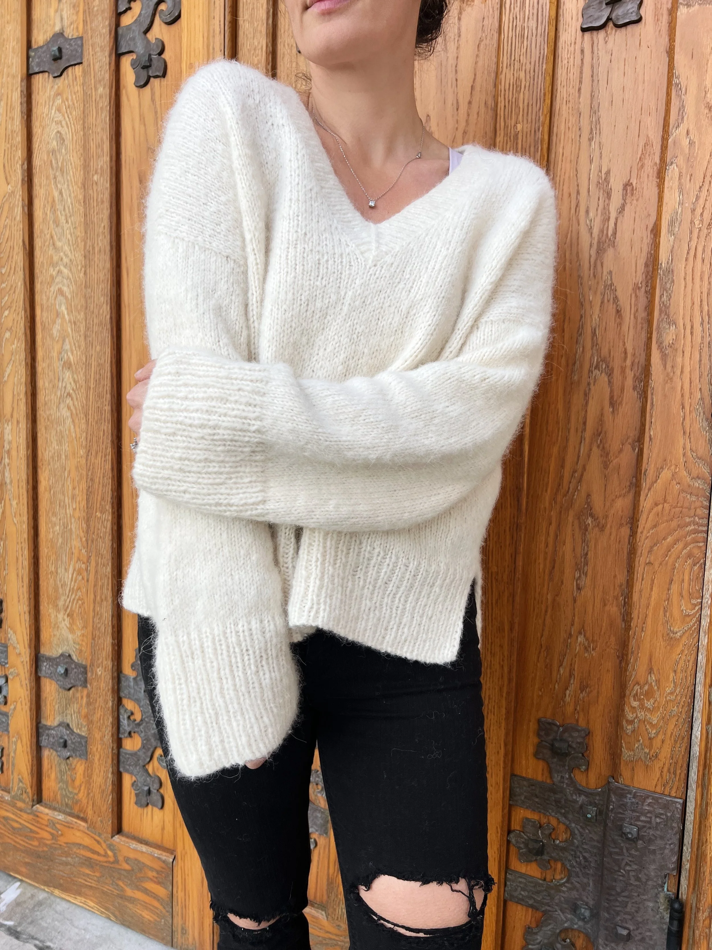 The Harlow sweater v neck is a deep v, oversized drop shoulder style pullover. It is a timeless classic that will keep you cozy and warm. It is constructed from the top down and it is worked flat and in the round in stockinette stitch. Sweater features a neat back shoulder detail, slits on each side of the waist and classic 2 x 2 rib around the neck, waist and sleeve cuffs. As an additional help, few videos are included in the pattern. 20 to 25 cm / 8” to 10” of positive ease is built in to the pattern, choose your size based on how much ease you prefer.