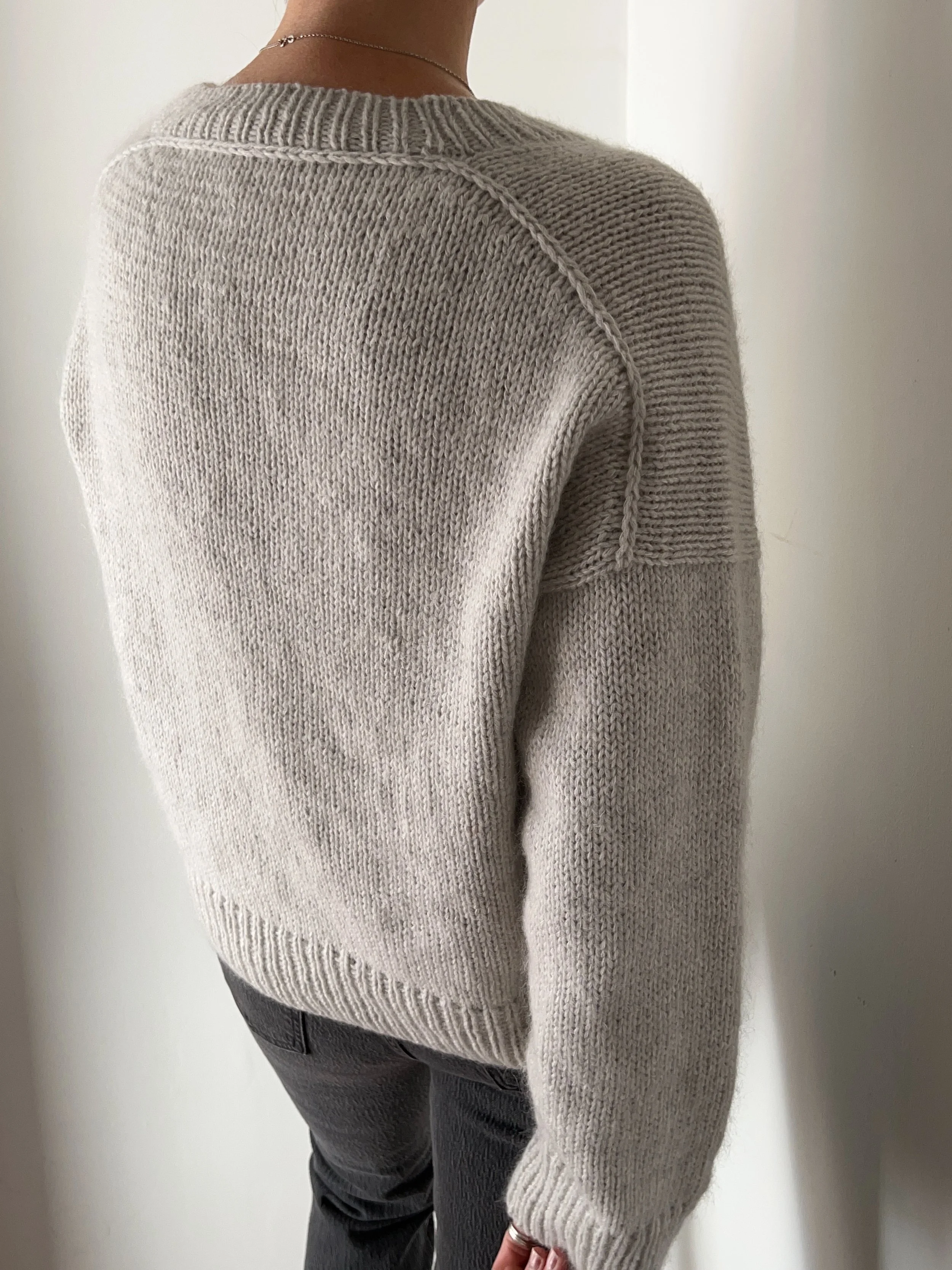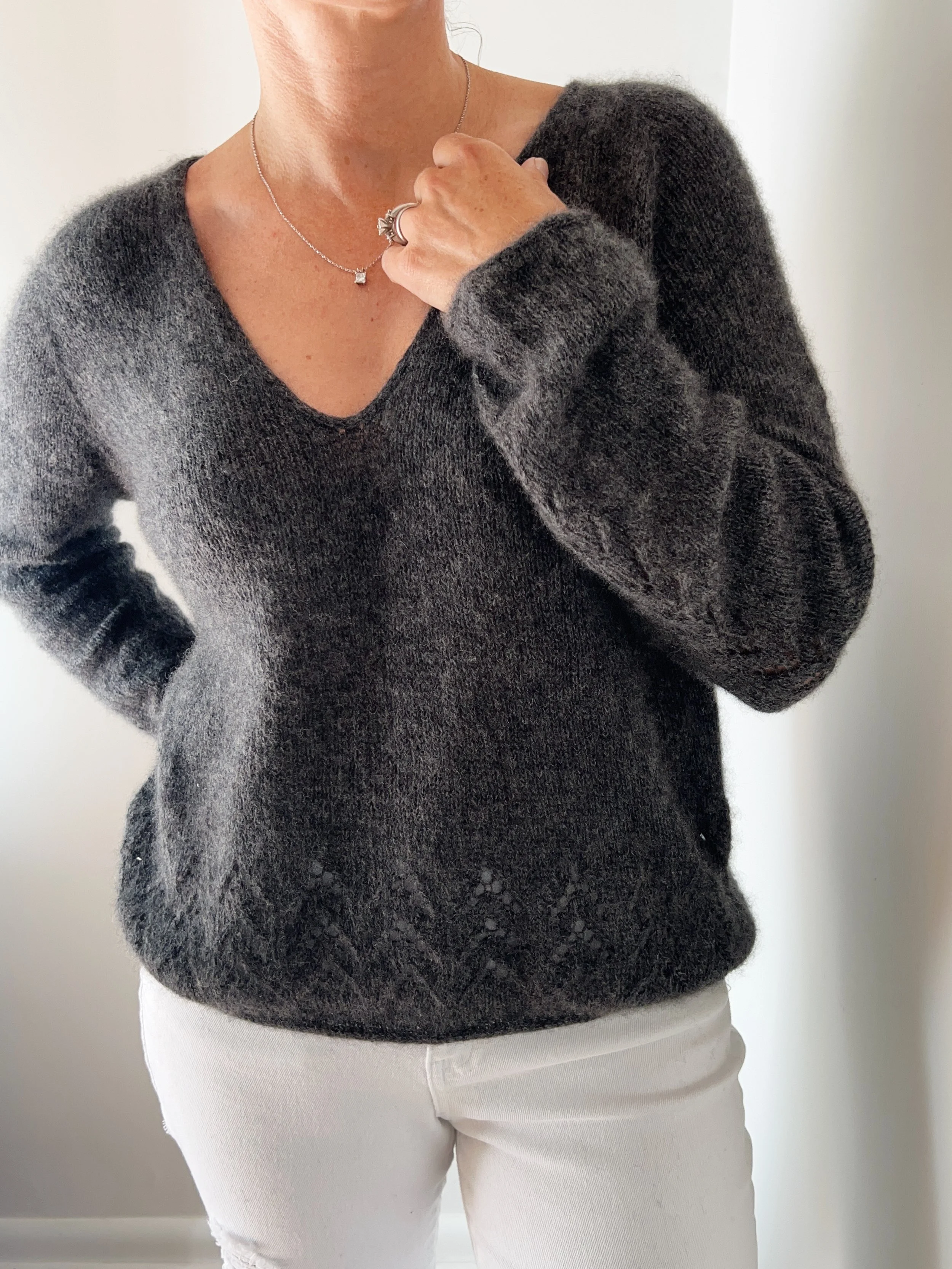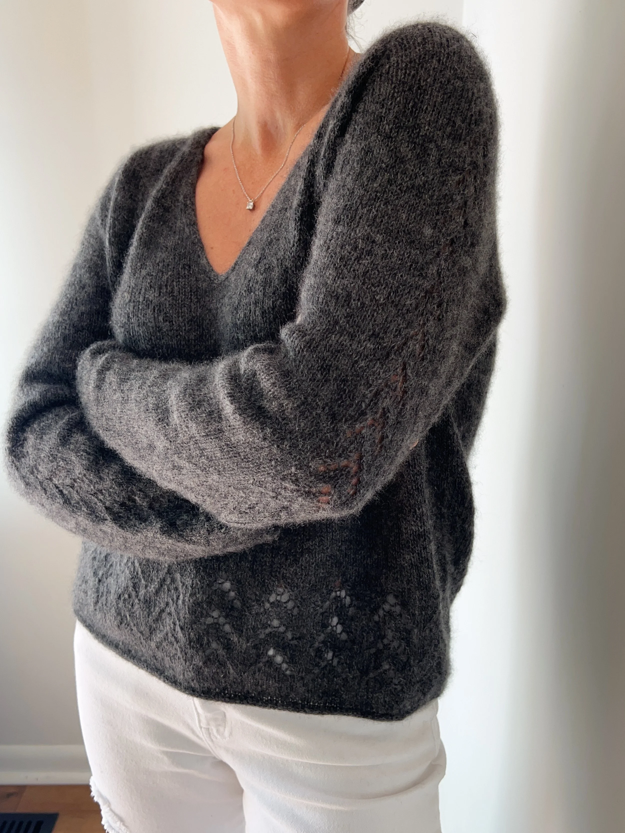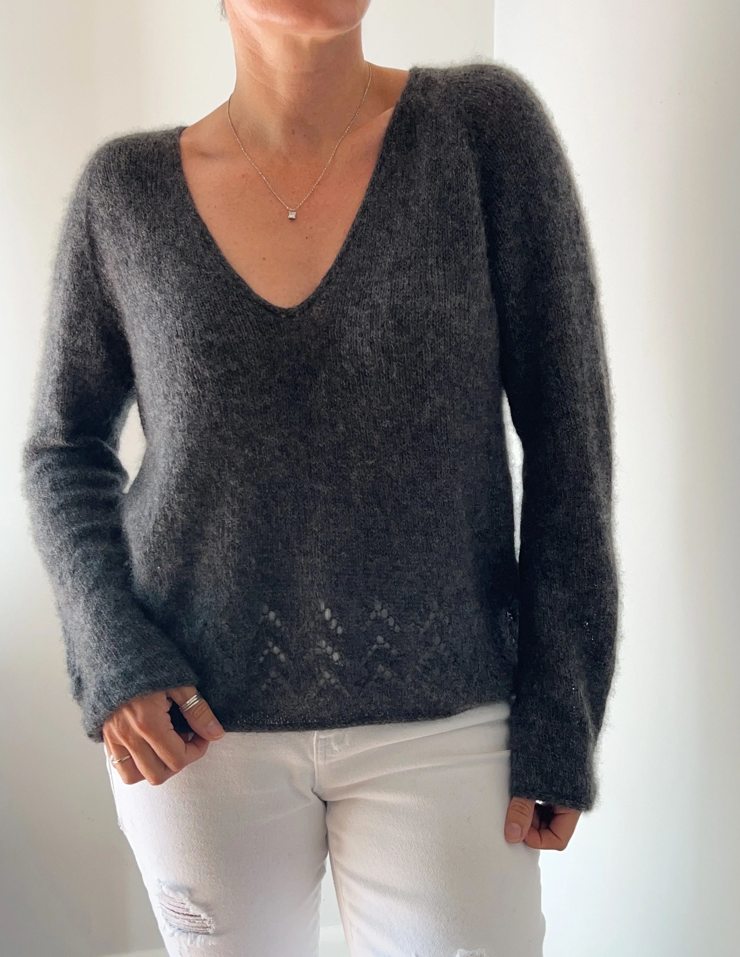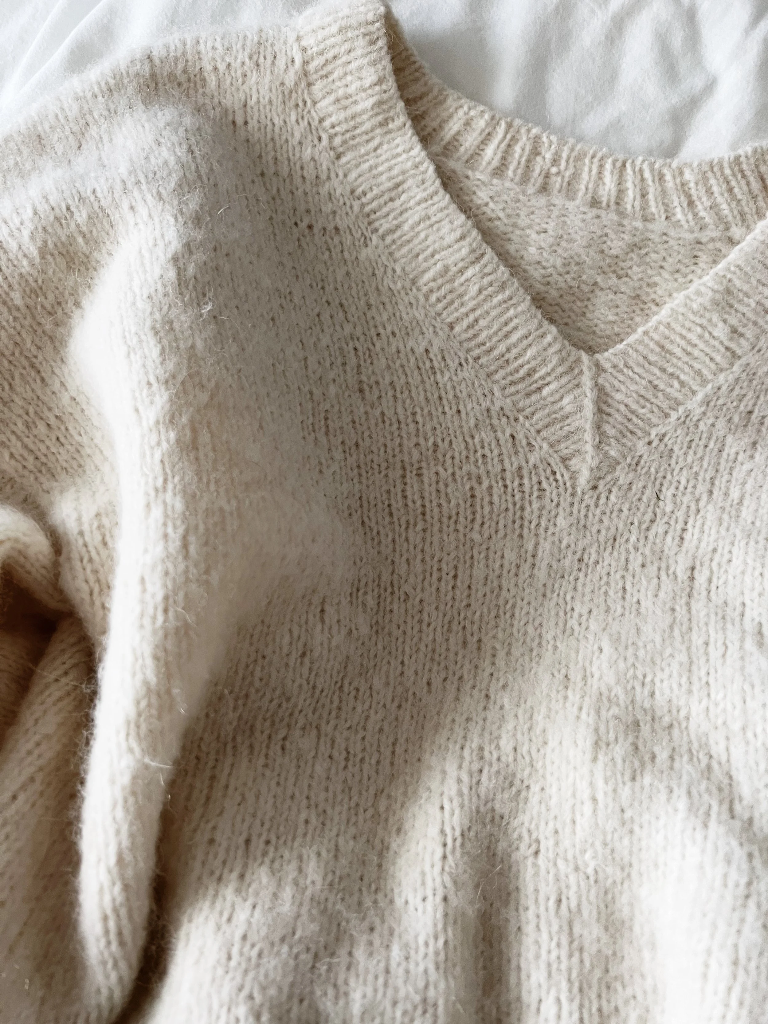 The Harlow sweater v neck is a deep v, oversized drop shoulder style pullover. It is a timeless classic that will keep you cozy and warm. It is constructed from the top down and it is worked flat and in the round in stockinette stitch. Sweater features a neat back shoulder detail, slits on each side of the waist and classic 2 x 2 rib around the neck, waist and sleeve cuffs. As an additional help, few videos are included in the pattern. 20 to 25 cm / 8” to 10” of positive ease is built in to the pattern, choose your size based on how much ease you prefer.